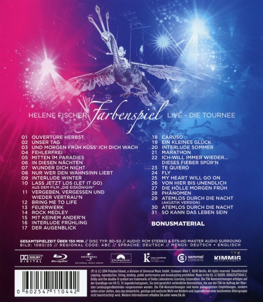 "Farbenspiel Live ? Die Tournee" auf Blu-Ray von Polydor bringt die mitreißenden Live-Auftritte von Helene Fischer direkt ins Wohnzimmer der Fans. Das Konzert-Highlight besticht durch eine beeindruckende Bühnenshow und emotionale Momente sowie energiegeladene Choreografien und Hits aus dem Erfolgsalbum ?Farbenspiel?. Dank des hochauflösenden Blu-Ray-Formats erlebt man jedes Detail hautnah mit. Der Hersteller Polydor ist ein traditionsreiches Musiklabel mit über 100-jähriger Geschichte und hat Weltstars wie ABBA oder The Who hervorgebracht. Hauptdarstellerin Helene Fischer zählt zu den erfolgreichsten deutschen Künstlerinnen aller Zeiten: Zahlreiche ECHO-Auszeichnungen und Millionen verkaufte Alben belegen ihren Ausnahmestatus im deutschsprachigen Raum. Regisseur Paul Dugdale ist international bekannt für seine Arbeit mit Superstars wie Adele oder Coldplay; musikalischer Leiter Christoph Papendieck sorgt für erstklassige Arrangements auf höchstem Niveau ? ein Muss für alle Musikfans!