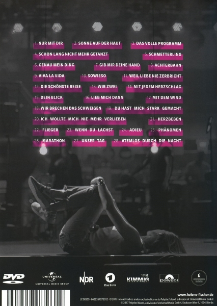 01. "Nur mit Dir (Live aus dem Kesselhaus München / 2017)" 02. "Sonne auf der Haut (Live aus dem Kesselhaus München / 2017)" 03. "Das volle Programm (Live aus dem Kesselhaus München / 2017)" 04. "Schon lang nicht mehr getanzt (Live aus dem Kesselhaus München / 2017)" 05. "Schmetterling (Live aus dem Kesselhaus München / 2017)" 06. "Genau mein Ding (Live aus dem Kesselhaus München / 2017)" 07. "Gib mir deine Hand (Live aus dem Kesselhaus München / 2017)" 08. "Achterbahn (Live aus dem Kesselhaus München / 2017)" 09. "Viva La Vida (Live aus dem Kesselhaus München / 2017)" 10. "Sowieso (Live aus dem Kesselhaus München / 2017)" 11. "Weil Liebe nie zerbricht (Live aus dem Kesselhaus München / 2017)" 12. "Die sch?nste Reise (Live aus dem Kesselhaus München / 2017)" 13. "Wir zwei (Live aus dem Kesselhaus München / 2017)" 14. "Mit jedem Herzschlag (Live aus dem Kesselhaus München / 2017)" 15. "Dein Blick (Live aus dem Kesselhaus München / 2017)" 16. "Lieb mich dann (Live aus dem Kesselhaus München / 2017)" 17. "Mit dem Wind (Live aus dem Kesselhaus München / 2017)" 18. "Wir brechen das Schweigen (Live aus dem Kesselhaus München / 2017)" 19. "Du hast mich stark gemacht (Live aus dem Kesselhaus München / 2017)" 20. "Ich wollte mich nie mehr verlieben (Live aus dem Kesselhaus München / 2017)" 21. "Herzbeben (Live aus dem Kesselhaus München / 2017)" 22. "Flieger (Live aus dem Kesselhaus München / 2017)" 23. "Wenn Du lachst (Live aus dem Kesselhaus München / 2017)" 24. "Adieu (Live aus dem Kesselhaus München / 2017)" 25. "Ph?nomen (Live aus dem Kesselhaus München / 2017)" 26. "Marathon (Live aus dem Kesselhaus München / 2017)" 27. "Unser Tag (Live aus dem Kesselhaus München / 2017)" 28. "Atemlos durch die Nacht (Live aus dem Kesselhaus München / 2017)" 29. "Menu / Helene Fischer / Das Konzert aus dem Kesselhaus"