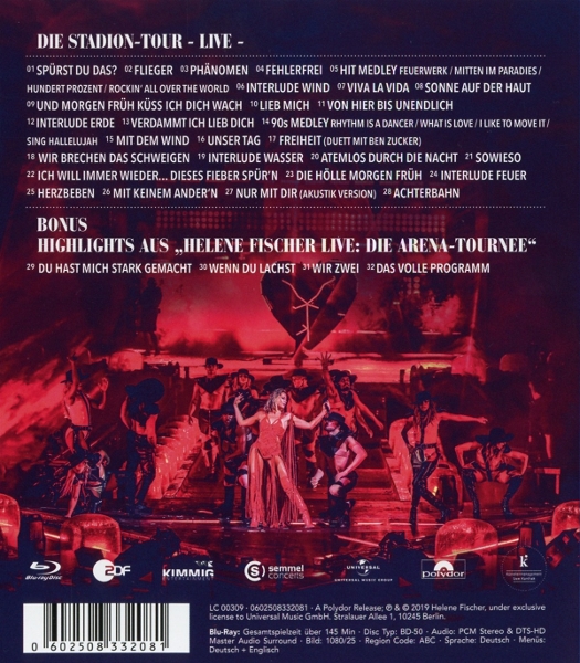 01. "Spürst du das? (Live von der Stadion-Tour)" 02. "Flieger (Live von der Stadion-Tour)" 03. "Ph?nomen (Live von der Stadion-Tour)" 04. "Fehlerfrei (Live von der Stadion-Tour)" 05. "Hit Medley (Live von der Stadion-Tour)" 06. "Interlude Wind (Live von der Stadion-Tour)" 07. "Sonnen Medley (Live von der Stadion-Tour)" 08. "Und morgen früh küss ich dich wach (Live von der Stadion-Tour)" 09. "Lieb mich (Live von der Stadion-Tour)" 10. "Von hier bis unendlich (Live von der Stadion-Tour)" 11. "Interlude Erde (Live von der Stadion-Tour)" 12. "Verdammt ich lieb' dich (Live von der Stadion-Tour)" 13. "90s Medley (Live von der Stadion-Tour / Edit)" 14. "Mit dem Wind (Live von der Stadion-Tour)" 15. "Unser Tag (Live von der Stadion-Tour)" 16. "Freiheit (Live von der Stadion-Tour)" 17. "Wir brechen das Schweigen (Live von der Stadion-Tour)" 18. "Interlude Wasser (Live von der Stadion-Tour)" 19. "Atemlos durch die Nacht (Live von der Stadion-Tour)" 20. "Sowieso (Live von der Stadion-Tour)" 21. "Ich will immer wieder... dieses Fieber spür'n (Live von der Stadion-Tour)" 22. "Die H?lle morgen früh (Live von der Stadion-Tour)" 23. "Interlude Feuer (Live von der Stadion-Tour)" 24. "Herzbeben (Live von der Stadion-Tour)" 25. "Mit keinem Ander'n (Live von der Stadion-Tour)" 26. "Nur mit Dir (Live von der Stadion-Tour / Akustik Version)" 27. "Achterbahn (Live von der Stadion-Tour)" 28. "Du hast mich stark gemacht (Live von der Arena-Tournee / 2018)" 29. "Wenn Du lachst (Live von der Arena-Tournee / 2018 / Re-Edit)" 30. "Wir zwei (Live von der Arena-Tournee / 2018 / Re-Edit)" 31. "Das volle Programm (Live von der Arena-Tournee / 2018)" 32. "Menü / Helene Fischer / Helene Fischer Live - Die Stadion-Tour"