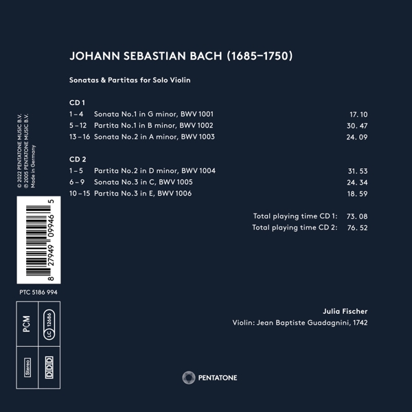 Beschreibung:First released in 2005, Julia Fischer's multiple award-winning recording of Johann Sebastian Bach's Sonatas & Partitas has proven to be an evergreen. In 2017, it was re-released as a lavish 3LP boxset, as well as a re-designed 2SACD edition. This legendary recording now returns in a more affordable Stereo version. This album is a RE-RELEASED VERSION of PTC5186095 (first released in 2005). Bach's remarkable Sonatas and Partitas for solo violin are revered for their boundless inventiveness, technical ingenuity and emotional depth. With their brilliant preludes, stately dances and complex four-part fugues, the demands on the performer are enormous - from rapid scale passages, double stopping and arpeggios, to the skill and concentration required to create the illusion of separately moving and interweaving voices. The set is full of surprises. Sonata No. 3 contains a colossal fugue of increasing complexity and difficulty (and at over 350 bars, one of his longest). Partita No. 3 is one of Bach's sunniest works, with the virtuoso Prelude and the charming Gavotte being regularly performed as encore pieces. Most famous of all is the legendary Chaconne from Partita No. 2, a kaleidoscopic series of variations as deeply felt and cathartic as anything Bach wrote and an incontestable milestone in classical music. Julia Fischer's recording for PENTATONE was showered with praise upon it's first release in 2005. "Classic accounts by Milstein and Grumiaux have been usurped by this extraordinarily gifted newcomer" enthused BBC Music Magazine. "Her mastery is beyond question," affirmed Gramophone magazine "her ability to trace a smooth, even line a source of pleasure itself." It also achieved the rare distinction of garnering three of France's most prestigious awards: the Diapason d'Or from Diapason; the CHOC from Le Monde de la Musique; and the highest rating from Classica-Repertoire., Runningtime: 00:00:00, Labelcode PNTA5186994.2