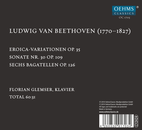 Beschreibung:More and more young German pianist Forian Glemser is establishing himself in concert life. Invitations to piano recitals and appearances with orchestras took him to almost all renowned concert halls in Germany, including Konzerthaus Berlin, Laeiszhalle Hamburg, Herkulessaal Munich, and others, as well as in other European countries in halls such as Wigmore Hall in London, Stefaniensaal in Graz, and the Brucknerhaus in Linz. For his debut with OehmsClassics, he wanted a pure Beethoven program that can hardly be more demanding. He has included the Eroica-Variationen Op. 35, the Sonate No. 30 Op. 109, and Sechs Bagatellen Op. 126- an impressive program for any career, much less that of such a young performer., Runningtime: 00:00:00, Labelcode OEHM1703.2