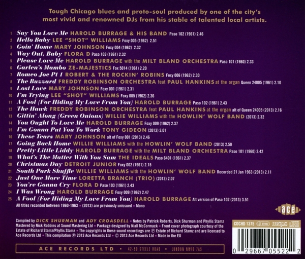 01. Burrage, Harold & His Band "Say you love me" 02. Williams, Lee "Shot" "Hello baby" 03. Johnson, Mary "Goin' home" 04. Flora D "Way out, baby" 05. Burrage, Harold / Bland, Milt Orchestra "Please love me" 06. Ze-Majestics "Garlen's mambo" 07. Robert & The Rockin' Robins "Romeo Joe [Part i]" 08. Robinson, Freddy Orchestra / Hankins, Paul "The buzzard" 09. Johnson, Mary "Lost love" 10. Williams, Lee "Shot" "I'm trying" 11. Burrage, Harold "A fool (for hiding my love from you)" 12. Robinson, Freddy Orchestra / Hankins, Paul "The hawk" 13. Williams, Willie / Howlin' Wolf Band "Gillin' along (Green onions)" 14. Burrage, Harold "You Ought To Love Me" 15. Gideon, Tony "I'm gonna put your to work" 16. Johnson, Mary "These Tears" 17. Williams, Willie / Howlin' Wolf Band "Going back home" 18. Burrage, Harold / Bland, Milt Orchestra "Pretty little Liddy" 19. Ideals, The "What's the matter with you Sam" 20. Detroit Junior "Christmas Day" 21. Williams, Willie / Howlin' Wolf Band "South park shuffle" 22. Branch, Loretta "Just one more time" 23. Flora D "You're gonna cry" 24. Burrage, Harold "I was wrong" 25. Burrage, Harold "A fool (for hiding my love from you)"