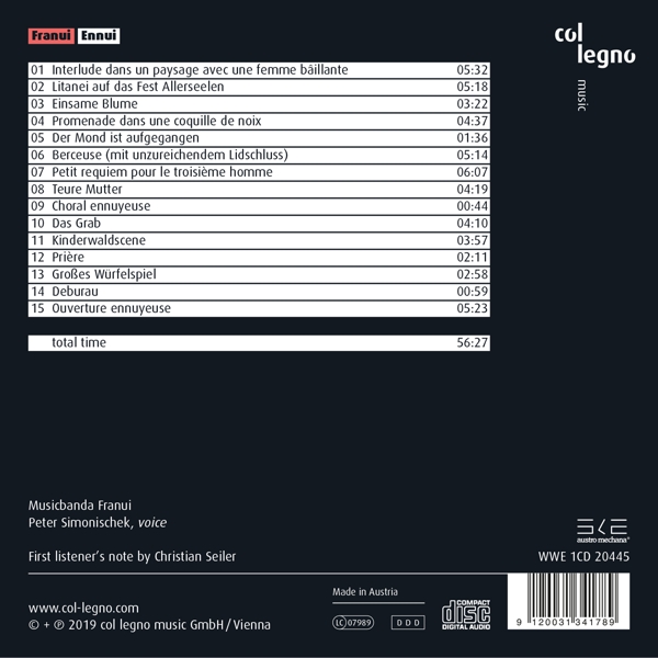 Beschreibung:This is an album about boredom. It takes the award-winning Musicbanda Franui, accompanied by great actor Peter Simonischek, away from their daily routine, back to the days of their childhood, and straight on to the graveyard. By ennui they don't mean dull, though. Rather, it refers to a state of existential boredom, the moment when you are seized by black emptiness, when you realize the absurdity of life - or in whichever other ways this state has been described by philosophers. One of them, Kierkegaard, claimed that boredom could never be suspended by work but only by amusement. Amusement, distraction, diversion, entertainment - or, in musical terms: divertimento. Franui have woven a memorable musical tale from brilliant examples of this genre, by Mozart, Satie, Schumann, and others. All there is left to say is: amuse yourselves!, Runningtime: 00:00:00, Ensemble: Franui, Voice: Peter Simonischek, Labelcode COL20445 (WWE 1CD 20445)