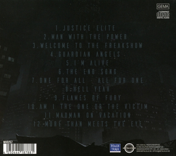 1. JUSTICE ELITE 2. MAN WITH THE POWER 3. WELCOME TO THE FREAKSHOW 4. GUARDIAN ANGELS 5. I M ALIVE 6. THE END SONG 7. ONE FOR ALL ALL FOR ONE 8. HELL YEAH 9. FLAMES OF FURY 10. AM I THE ONE OR THE VICTIM 11. MADMAN ON VACATION 12. MORE THAN MEETS THE EYE |