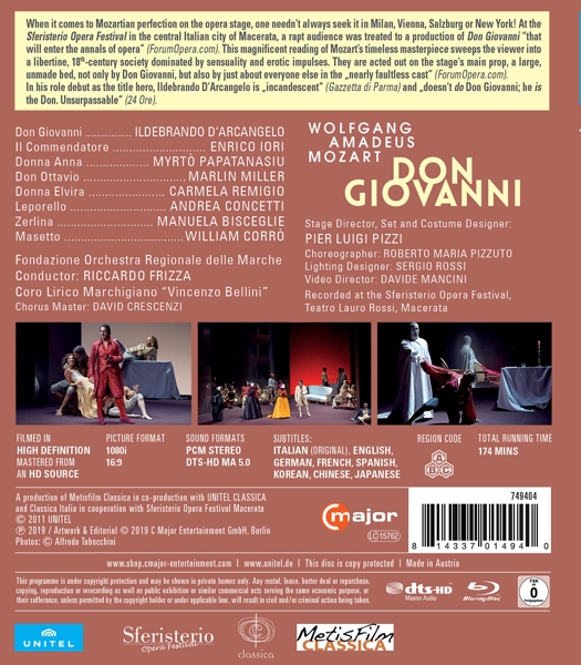 Beschreibung:When it comes to Mozartian perfection on the opera stage, one needn't always seek it in Milan, Vienna, Salzburg or New York! At the Sferisterio Opera Festival in the central Italian city of Macerata, a rapt audience was treated to a production of Don Giovanni "that will enter the annals of opera" (ForumOpera. Com). This magnificent reading of Mozart's timeless masterpiece sweeps the viewer into a libertine, 18th- century society dominated by sensuality and erotic impulses. They are acted out on the stage's main prop, a large, unmade bed, not only by Don Giovanni, but also by just about everyone else in the "nearly faultless cast" (ForumOpera. Com). In his role debut as the title hero, Ildebrando D'Arcangelo is "incandescent" (Gazzetta die Parma) and "doesn't do Don Giovanni; he is the Don. Unsurpassable"(24 Ore)., Runningtime: 00:00:00, Labelcode CMAJ749404BR