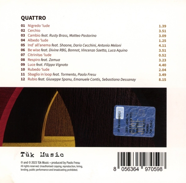 01. Gaias, Nanni "Nigredo 'lude" 02. Gaias, Nanni "Cerchio" 03. Gaias, Nanni / Rusty Brass / Pastorino, Matteo "Cambio" 04. Gaias, Nanni "Albedo 'lude" 05. Gaias, Nanni / Shaone / Cecchini, Dario / Meloni, Antonio "Ind' all'anema" 06. Gaias, Nanni / Divine RBG / Bonnot / Saetta, Vincenzo / Aquino, Luca "Be wise" 07. Gaias, Nanni "Cinitras 'lude" 08. Gaias, Nanni / Zamua "Respiro" 09. Gaias, Nanni / Vignato, Filippo "Luce" 10. Gaias, Nanni "Rubedo 'lude" 11. Gaias, Nanni / Tormento / Fresu, Paolo "Sbaglio in loop" 12. Gaias, Nanni / Spanu, Giuseppe / Contis, Emanuele / Dessanay, Sebastiano "Rubio"