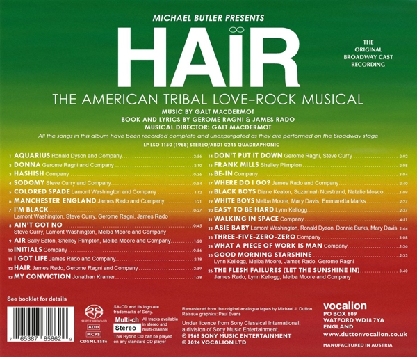 1: Aquarius (2:56) 2: Donna (2:10) 3: Hashish (0:36) 4: Sodomy (0:54) 5: Colored Spade (1:12) 6: Manchester England (1:21) 7: I'm Black (0:27) 8: Ain't Got No (0:45) 9: Air (1:28) 10: Initials (0:56) 11: I Got Life (2:18) 12: Hair (2:59) 13: My Conviction (1:38) 14: Don't Put It Down (2:02) 15: Frank Mills (2:08) 16: Be-In (3:04) 17: Where Do I Go? (2:40) 18: Black Boys (1:09) 19: White Boys (2:27) 20: Easy To Be Hard (2:37) 21: Walking In Space (4:51) 22: Abie Baby (2:44) 23: Three-Five-Zero-Zero (3:08) 24: What A Piece Of Work Is Man (1:36) 25: Good Morning Starshine (2:33) 26: The Flesh Failures (Let The Sunshine In) (3:40)