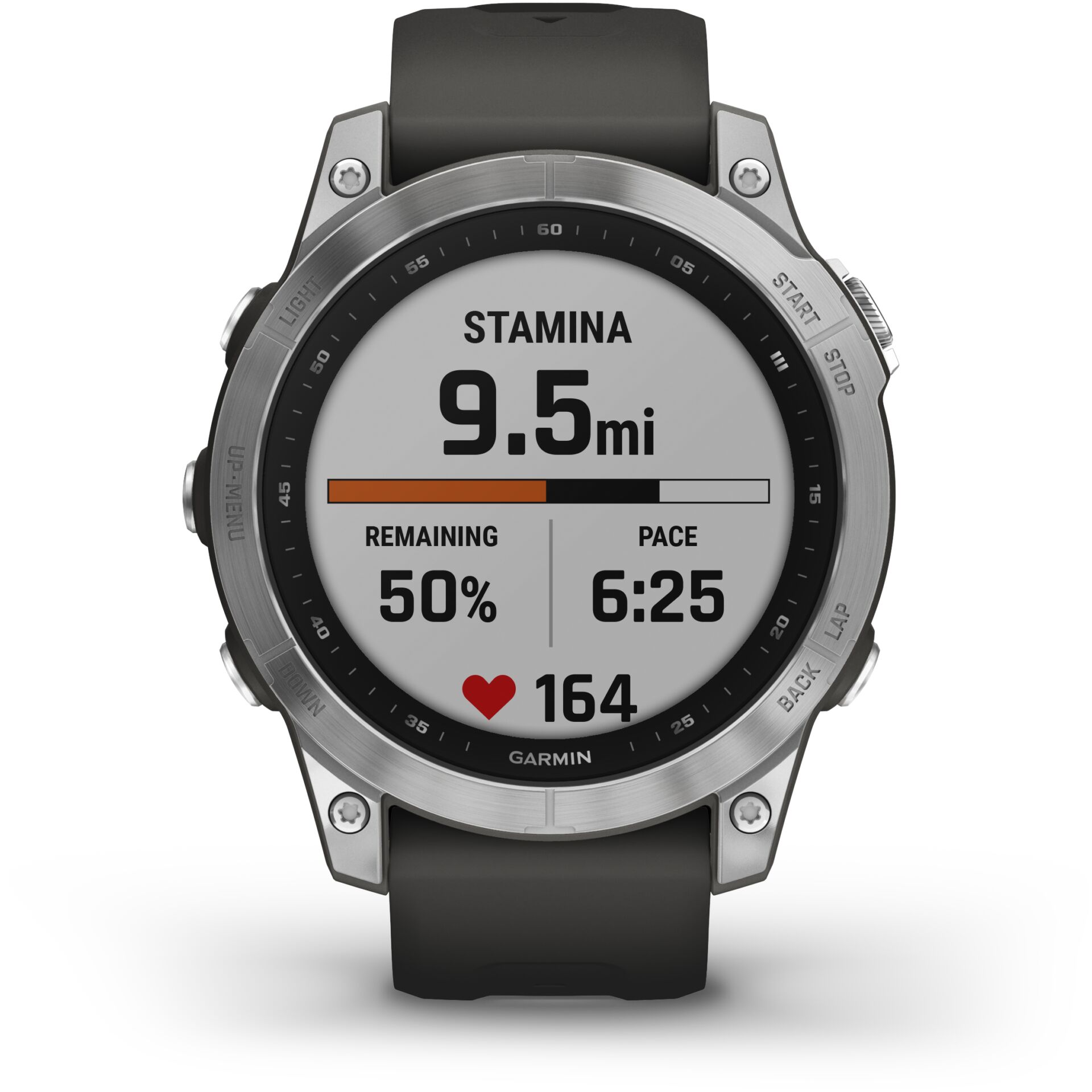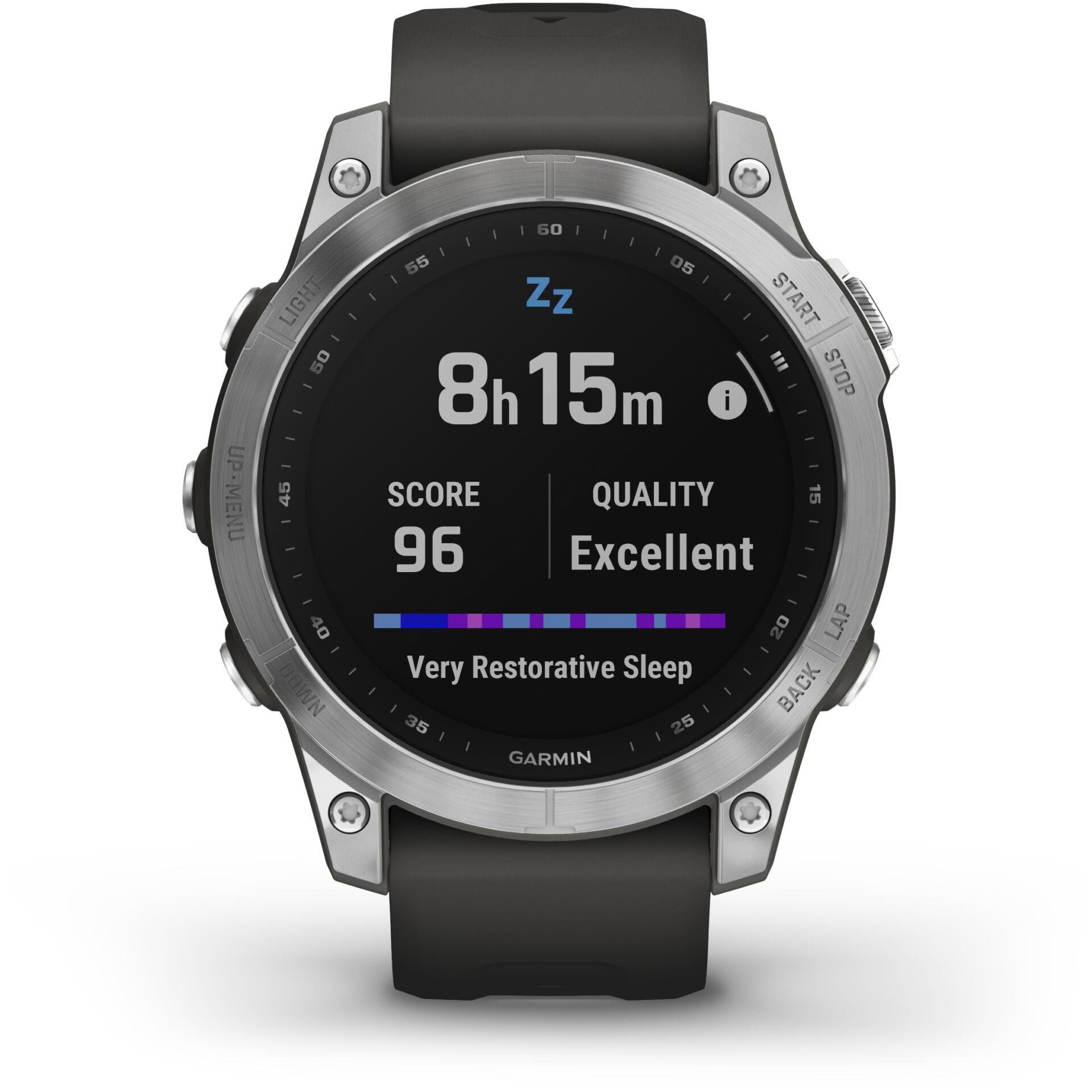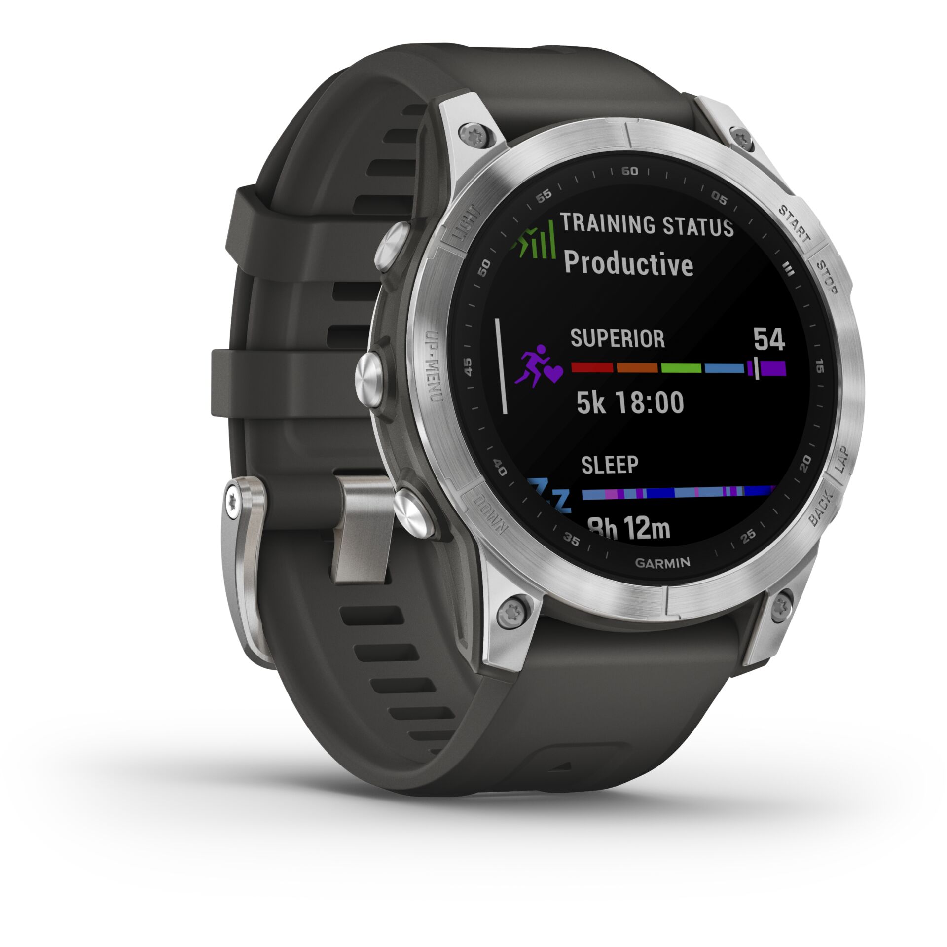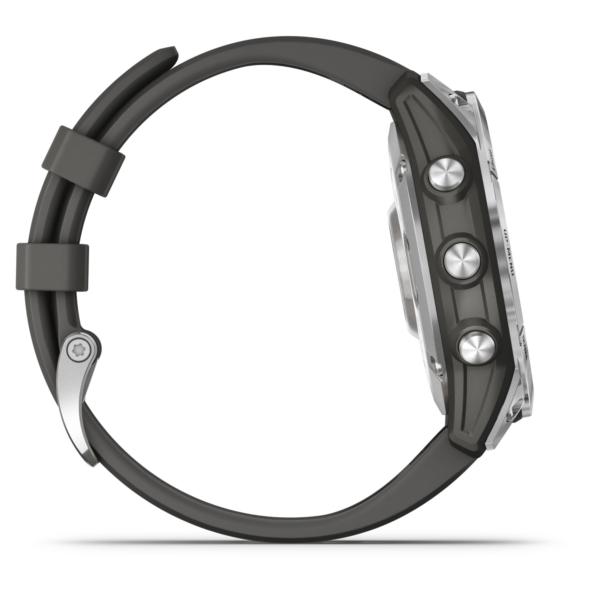 Die Garmin fenix 7 Graphit/Silber ist eine hochwertige Multisport-GPS-Smartwatch für anspruchsvolle Sportler und Outdoor-Fans mit höchsten Ansprüchen an Funktionalität und Zuverlässigkeit. Das robuste Gehäuse aus faserverstärktem Polymer mit Edelstahl-Lünette vereint Langlebigkeit mit modernem Design ? perfekt für jedes Abenteuer! Das stets ablesbare Farbdisplay (1,3 Zoll) bleibt auch bei direkter Sonneneinstrahlung klar sichtbar und der Akku hält im Smartwatch-Modus beeindruckende bis zu 18 Tage durch ? ideal für lange Touren ohne ständiges Nachladen. Technisch überzeugt die Uhr durch Multi-Band-GNSS-Unterstützung zur präzisen Positionsbestimmung sowie Herzfrequenzmessung am Handgelenk und Pulsoximeter zur Überwachung des Blutsauerstoffgehalts. Barometer, Kompass sowie Gyroskop und Thermometer runden das Sensorpaket ab ? optimal für Wanderungen oder Bergtouren! Mehr als 30 vorinstallierte Sport-Apps wie Laufen, Radfahren oder Golf bieten vielseitige Trainingsmöglichkeiten inklusive fortschrittlicher Funktionen wie VO2max-Schätzung oder Erholungsratgeber. Über die Connect IQ Plattform lässt sich die Uhr individuell erweitern (Apps & Widgets). Smarte Benachrichtigungen informieren über Anrufe/Nachrichten direkt am Handgelenk (bei Kopplung mit dem Smartphone). Kartenmaterial inkl. TopoActive Europa erleichtert Navigation unterwegs; Musik kann lokal gespeichert werden (Spotify/Deezer/Amazon Music). Garmin steht nicht nur für innovative Technik sondern engagiert sich aktiv im Bereich Nachhaltigkeit: Viele Produkte werden umweltfreundlich verpackt geliefert; Produktionsprozesse setzen zunehmend auf Abfallvermeidung und energieeffiziente Standorte weltweit sind Standard geworden. Mit dem Kauf einer Garmin fenix 7 leisten Sie einen Beitrag zum Umweltschutz ? profitieren Sie von Spitzentechnologie eines verantwortungsbewussten Herstellers!