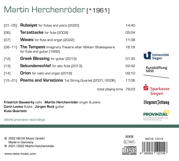 Rubaiyat für Fl?tu und Klavier (2020) 01. Levine, Carin "Sterne und Menschen (für Carin Levine)" 02. Levine, Carin "Letzte Sicherheiten (für Navid Kermani)" 03. Levine, Carin "Gemischte Gefühle (für Rainer Berger)" 04. Levine, Carin "Undeutliche Botschaften" 05. Levine, Carin "Nachbeben" 06. Levine, Carin "Terzattacke für Fl?te (für Michael Sauer) (2009)" 07. Herchenr?der, Martin "Waves für Fl?te und Orgel (für Carin Levine) (2022)" The Tempest für Fl?te und Gitarre (Imagin?res Theaterstück nach William Shakespeare) (1992) 08. Levine, Carin "Music of the island" 09. Levine, Carin "Caliban's revolution" 10. Levine, Carin "Music of the island" 11. Levine, Carin "Ariel (spriting gently)" 12. Ruck, Jürgen "Greek blessing für Gitarre (für Nicholas Goluses) (2013)" 13. Levine, Carin "Sekundenschlaf für Alt-Fl?te (für Michael Sauer) (2013)" 14. Gauwerky, Friedrich "Orion für Cello und Orgel (für Friedrich Gauwerky) (2018)" Poems and variations für Streichquartett (für das Arditty Quartett) (2001/2006) 15. Kuss Quartett "Anmutig" 16. Kuss Quartett "Sehr langsam" 17. Kuss Quartett "Kraftvoll, mit d?monischer Energie" 18. Kuss Quartett "Entrückt" 19. Kuss Quartett "Unruhig und heftig" 20. Kuss Quartett "Geheimnisvoll" 21. Kuss Quartett "Feierlich und gemessen"