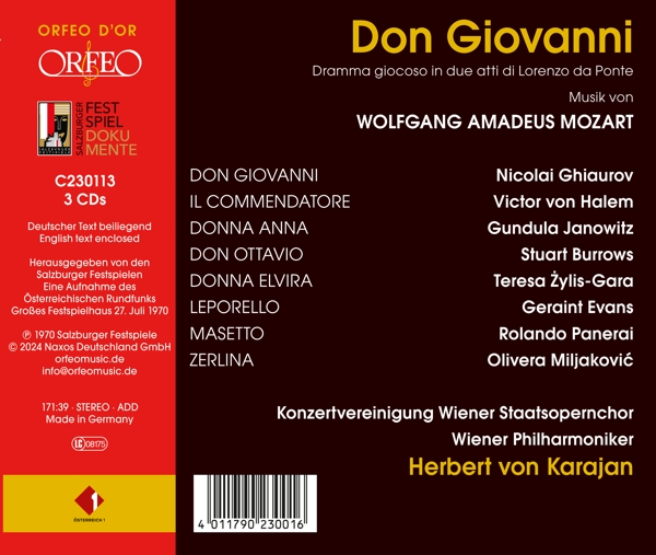 | | Beschreibung: | This is a physical only re-issue of a former ORFEO bestseller. Herbert von Karajan's relationship with the operas of Wolfgang Amadeus Mozart was quite ambivalent, especially in his early years. Later, however, he increasingly turned to these works and conducted Don Giovanni at the Salzburg Festival in a total of three different productions. This recording from 1970 follows the 1968 production. The top-class cast of singers also remained similar, with only two roles being recast. However, while the Festival audience was impressed, the critical response was mixed. From today's perspective, the live recording from 1970 presents a Don Giovanni which takes it's place among the legendary performances of the Salzburg Festival.The title role is sung by the Bulgarian bass Nicolai Ghiaurov, who, between the Bolshoi Theatre in Moscow, the Sofia Opera and La Scala in Milanm has grown into a great dramatic singer. His Leporello was the equally strongly outlined Geraint Evans. The Welsh baritone had already proven his extraordinary abilities as a character actor at the Festival in 1962-67 as Mozart's Figaro. As Donna Anna, Gundula Janowitz is at the zenith of her development, which was largely promoted by Karajan. Polish-born Teresa Zylis-Gara, successful as a Mozart singer at Glyndebourne and elsewhere, also fitted perfectly as Dona Elivra into Karajan's concept of the role: sensitive, wavering between her pain and the feelings for Don Giovanni, which surface again and again., Runningtime: 00:00:00, Labelcode OEO230113.2 |  | | Herstellernummer: |