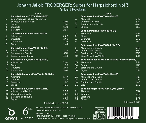 1.1 Suite in G minor, FBWV 614-Lamentation Sur Ce Que J'ay ÉTÉ Volé Et Se Joüe À la Discretion1.2 Suite in G minor, FBWV 614-Gigue1.3 Suite in G minor, FBWV 614-Courante1.4 Suite in G minor, FBWV 614-Sarabande1.5 Suite in E minor, FBWV 622-Allemande1.6 Suite in E minor, FBWV 622-Courante1.7 Suite in E minor, FBWV 622-Sarabande1.8 Suite in E minor, FBWV 622-Gigue1.9 Suite in F Major, FBWV 621-Allemande and Double1.10 Suite in F Major, FBWV 621-Courante and Double1.11 Suite in F Major, FBWV 621-Sarabande and Double1.12 Suite in D minor, FBWV 613-Allemande1.13 Suite in D minor, FBWV 613-Gigue1.14 Suite in D minor, FBWV 613-Courante1.15 Suite in D minor, FBWV 613-Sarabande1.16 Suite in B Flat Major, FBWV Anh. Iv/08-Allemand1.17 Suite in B Flat Major, FBWV Anh. Iv/08-Courant1.18 Suite in B Flat Major, FBWV Anh. Iv/08-Saraband1.19 Suite in B Flat Major, FBWV Anh. Iv/08-Gigue1.20 Suite in D minor, FBWV 639-Allemand and Double1.21 Suite in D minor, FBWV 639-Courant and Double1.22 Suite in D minor, FBWV 639-Saraband and Double1.23 Suite in D minor, FBWV 639-Gigue2.1 Suite in G minor, FBWV 649-Allemand2.2 Suite in G minor, FBWV 649-Courant and Double2.3 Suite in G minor, FBWV 649-Sarabande and Double2.4 Suite in G minor, FBWV 649-Chique2.5 Suite in D Major, FBWV 611-Allemande2.6 Suite in D Major, FBWV 611-Gigue2.7 Suite in D Major, FBWV 611-Courante2.8 Suite in D Major, FBWV 611-Sarabande2.9 Suite in a Minor, FBWV 628A-Allemand and Double2.10 Suite in a Minor, FBWV 628A-Courant and Double2.11 Suite in a Minor, FBWV 628A-Saraband and Double2.12 Suite in a Minor, FBWV 628-Gigue2.13 Suite in E minor, FBWV 648 "Partita Dolorosa"-Allemande2.14 Suite in E minor, FBWV 648 "Partita Dolorosa"-Courant2.15 Suite in E minor, FBWV 648 "Partita Dolorosa"-Saraband and Double2.16 Suite in E minor, FBWV 648 "Partita Dolorosa"-Gigue2.17 Suite in C minor, FBWV 644-Allemand and Double2.18 Suite in C minor, FBWV 644-Courante and Double2.19 Suite in C minor, FBWV 644-Saraband and Double2.20 Suite in C minor, FBWV 644-Gique2.21 Suite in F Major, FBWV Anh. 02-Allemand2.22 Suite in F Major, FBWV Anh. 02-Courant2.23 Suite in F Major, FBWV Anh. 02-Saraband2.24 Suite in F Major, FBWV Anh. 02-Gique |
