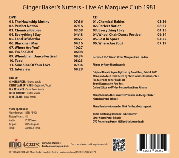 Beschreibung: | Ginger Baker was a member of Hawkwind for a short time in 1980, but left the band already after the album "Levitation". However, Ginger Baker's manager Roy Ward had already planned a tour of Italy for March 1981, albeit for Hawkwind. But that didn't stop Ginger from putting together a band to play the concerts himself. He wanted to present a fait accompli to the promoters. The new band was called "Ginger Baker Nutters" and included Keith Hale (keyboards, vocals) from Hawkwind, his old friend Riki Legair (bass), as well as Ian Trimmer (sax/vocals) and Billy Jenkins (guitar/vocals), who had previously recorded two great albums with Burlesque on Arista and were touring as an idiosyncratic comedy jazz fusion duo. - After a successful tour of Italy, the Nutters worked on new songs and played two shows at the legendary Marquee Club in London on May 18 and 19, 1981, which were recorded by Ian Trimmer's friend Andy Shuttleworth and his camera crew. - The original U-Matic tapes, long lost, resurfaced in the fall of 2023 and have since undergone extensive restoration. Now, for the first time, this concert by this great band, which Ginger described in an interview as his most innovative band since "Airforce, " is available., Runningtime: 00:00:00, Labelcode 05267092 |