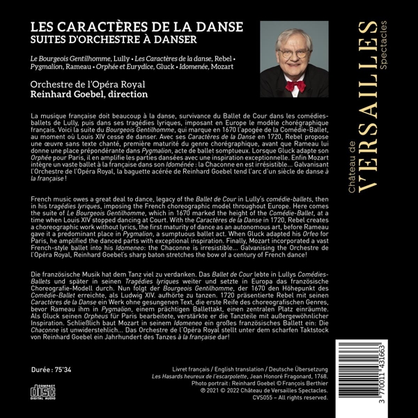 Beschreibung:French music owes a great deal to dance, from the survival of the Ballet de Cour in the comedies-ballets of Lully, to his tragedies lyriques, these compositions imposed the French choreographic model in Europe. Here is the sequel to Le Bourgeois Gentilhomme, which in 1670 marked the peak of the Comédie-Ballet, when Louis XIV stopped dancing. With his Characters of the Dance in 1720, Rebel offers a work without sung text, the first maturity of the choreographic genre, before Rameau gives it a prominent place in Pygmalion, a sumptuous ballet act. When Gluck adapts his Orphée for Paris, he amplifies the danced parts with exceptional inspiration. Finally, Mozart integrates a vast French-style ballet into his Idoménée: the Chaconne is irresistible... Galvanizing the Royal Opera Orchestra, Reinhard Goebel's sharp baton stretches the arc of a century of French-style dance !, Runningtime: 00:00:00, Directed By: Reinhard Goebel, Engineer, Post Production: Manuel Mohino, Orchestra: Orchestre De L'Opéra Royal, Violin, Soloist: Stefan Plewniak, Composed By: Jean-Baptiste Lully, Composed By: Jean-Féry Rebel, Composed By: Jean-Philippe Rameau, Composed By: Christoph Willibald Gluck, Composed By: Wolfgang Amadeus Mozart, Labelcode CHAV55.2 (CVS055), Phonographic Copyright (p) Château de Versailles Spectacles, Copyright (c) Château de Versailles Spectacles, Recorded At Château de Versailles, Made By Sonopress
