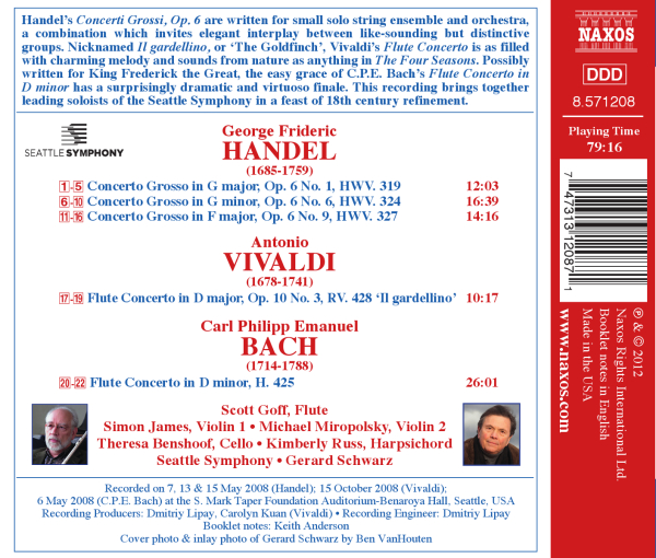 Beschreibung:Handel's Concerti Grossi, Op. 6 are written for small solo string ensemble and orchestra, a combination which invites elegant interplay between like-sounding but distinctive groups. Nicknamed Il gardellino, or 'The Goldfinch', Vivaldi's Flute Concerto is as filled with charming melody and sounds from nature as anything in the Four Seasons. Possibly written for King Frederick the Great, the easy grace of C.P.E. Bach's Flute Concerto in D minor has a surprisingly dramatic and virtuoso finale. This recording brings together leading soloists of the Seattle Symphony in a feast of 18th century refinement., Labelcode NXS8571208.2