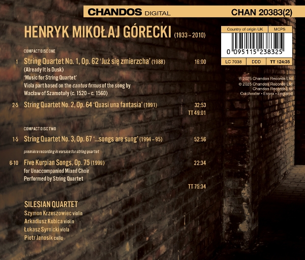 Beschreibung:The Gramophone Award-winning Silesian Quartet present a double-album of the complete works for string quartet by compatriot Henryk Gorecki. All three of his numbered string quartets were written late in life - the first in 1988 - and all three were commissioned by the Kronos Quartet. The First Quartet is a single-movement work, based on a sixteenth-century song by Waclaw of Szamotuly. The Second, double the length of the First, is subtitled 'quasi una fantasia' and follows a classical four-movement form, subtly referencing Beethoven. Gorecki completed the Third Quartet (double the length of the Second!) after the Symphony of Sorrowful Songs had catapulted his music to much wider acclaim. It extends to five movements and is considered by many to be one of his greatest compositions. In the 1980s and 1990s, Gorecki composed several collections of choral songs. Five Kurpian Songs is based on folksongs from Kurpie, a region north-west of Warsaw. The composer himself suggested that these works would be effective when performed by a string quartet, and here the Silesian Quartet gives us the world premiere recording of that version., Runningtime: 00:00:00, Labelcode CHN20383(2).2