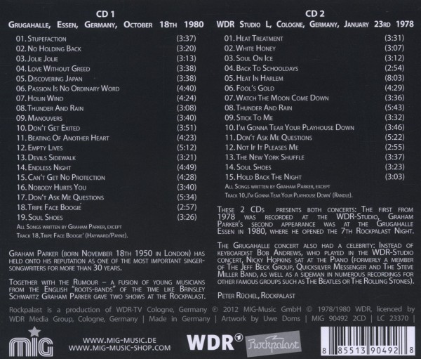 | Beschreibung: | Bass: Andrew Bodnar, Bass, Vocals: Andrew Bodnar, Drums, Percussion, Backing Vocals: Steve Goulding, Drums, Vocals: Steve Goulding, Engineer: Arnold Van Asselt, Engineer: Ewald Gerhardt, Guitar, Backing Vocals: Brinsley Schwarz (2), Guitar, Backing Vocals: Martin Belmont, Guitar, Vocals: Brinsley Schwarz (2), Guitar, Vocals: Martin Belmont, Keyboards, Backing Vocals: Bob Andrews, Liner Notes: Peter Rüchel, Mastered By: Helmut Hoppenstedt, Piano: Nicky Hopkins, Saxophone: Albie Donnelly, Saxophone: John Earle, Trombone: Danny Ellis, Trumpet: Dick Hanson, Vocals, Guitar: Graham Parker, Written-By: Graham Parker, Written-By: Bill Payne, Written-By: Richie Hayward, Written-By: Earl Randle, Labelcode 05121982 (MIG90492), Record Company MIG-Music GmbH, Recorded At Grugahalle, Recorded At WDR Studio, Köln, Recorded At Rockpalast |  | Anzahl der Titel: |