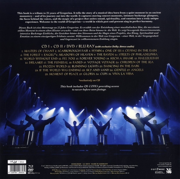 "25 LIVE (Ltd. Deluxe Edition)" von Gregorian ist eine besondere CD+DVD-Veröffentlichung zum 25-jährigen Jubiläum dieses einzigartigen Musikprojekts. Die Deluxe-Edition enthält sowohl Audio- als auch Videoaufnahmen ihrer spektakulären Live-Auftritte und fängt die Essenz des typischen Stils von Gregorian ein: moderne Pop- und Rockhits im mittelalterlichen gregorianischen Chorgesang interpretiert. Fans dürfen sich auf kraftvolle Versionen bekannter Klassiker freuen ? dargeboten mit beeindruckenden Gesangsarrangements und einer Atmosphäre voller Magie und Mystik ? genau das Markenzeichen der Band weltweit! Der Hersteller EARMUSIC steht für hochwertige Musikproduktionen verschiedenster Genres und präsentiert diesen Meilenstein stilvoll mit exzellenter Ton- und Bildqualität.