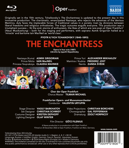 | | Beschreibung: | Originally set in the 15th century, Tchaikovsky's "The Enchantress" is updated to the present day in this innovative production. The charismatic, emancipated Nastasya, who rejects the advances of the devious Mamïrov, duly faces the implacable forces of traditional values in a society riven by divisions between liberal freedoms and religious orthodoxies. The tragic outcome engulfs everyone. This production was a triumphant success - 'At the end, storms of enthusiasm, the likes of which are rare even at Oper Frankfurt' (Neue Musikzeitung) - both for the staging and performers, with soprano Asmik Grigorian hailed as a 'miracle' and baritone Iain MacNeil as 'world class'., Runningtime: 00:00:00, Labelcode NXS180BR |  | | Darsteller: |