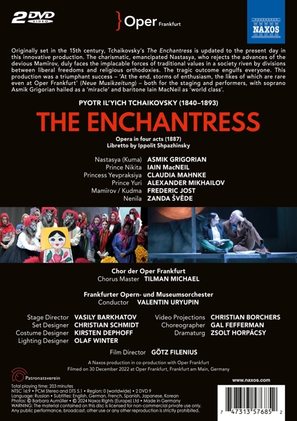 | | Beschreibung: | Originally set in the 15th century, Tchaikovsky's "The Enchantress" is updated to the present day in this innovative production. The charismatic, emancipated Nastasya, who rejects the advances of the devious Mamïrov, duly faces the implacable forces of traditional values in a society riven by divisions between liberal freedoms and religious orthodoxies. The tragic outcome engulfs everyone. This production was a triumphant success - 'At the end, storms of enthusiasm, the likes of which are rare even at Oper Frankfurt' (Neue Musikzeitung) - both for the staging and performers, with soprano Asmik Grigorian hailed as a 'miracle' and baritone Iain MacNeil as 'world class, Runningtime: 00:00:00, Labelcode NXS2110768-69DVD |  | | Darsteller: |
