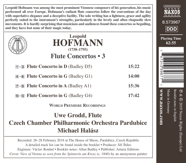 Beschreibung:Leopold Hofmann was among the most prominent Viennese composers of his generation, his music performed all over Europe. Hofmann's radiant flute concertos follow the conventions of the day with superlative elegance and a deceptive facility. The solo writing has a lightness, grace and agility perfectly suited to the instrument's strengths, particularly in the lovely and often rhapsodic slow movements. It is hardly surprising that musicians and audiences found these concertos so beguiling, and they have lost none of their magic today. The works are performed by award-winning flautist Uwe Grodd and the Czech Chamber Philharmonic Orchestra Pardubice., Runningtime: 00:00:00, Composed By: Leopold Hofmann, Conductor: Michael Halász, Engineer: Václav Roubal, Flute: Uwe Grodd, Liner Notes: Allan Badley, Orchestra: Komorní Filharmonie Pardubice, Producer: Ji?í ?tilec, Labelcode NXS8573967.2 (8.573967), Phonographic Copyright (p) Naxos Rights Europe Ltd, Copyright (c) Naxos Rights Europe Ltd, Published By Artaria Editions, Recorded At The House Of Music, Pardubice, Glass Mastered At Arvato