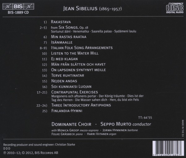 01. Groop, Monica "Rakastava (Der Liebende) (für Mezzosopran, Bariton und gemischten Chor)" Lieder op. 18 (für M?nnerchor) (Auszug) 02. Dominante Choir "Nr. 1: Sortunut ??ni (Gebrochene Stimme) (für gemischten Chor bearb. von Jean Sibelius)" 03. Dominante Choir "Nr. 3: Venematka (Die Kahnfahrt) (für gemischten Chor bearb. von Jean Sibelius)" 04. Dominante Choir "Nr. 4: Saarella palaa (Auf der Insel brennt ein Feuer) (für gemischten Chor bearb. von Jean Sibelius)" 05. Dominante Choir "Nr. 6: Syd?meni laulu (Lied meines Herzens) (für gemischten Chor bearb. von Jean Sibelius)" 06. Dominante Choir "Min rastas raataa (Fleißig wie eine Drossel)" 07. Dominante Choir "Is?nmaalle (An das Vaterland)" 08. Gr?sbeck, Folke "Oje Carul (O Caroline) (bearb. von Jean Sibelius)" 09. Gr?sbeck, Folke "Trippole trappole (bearb. von Jean Sibelius)" 10. Dominante Choir "Listen to the water mill (Lausche der Wassermühle) (Fragment)" 11. Dominante Choir "Ej med klagan (Nicht sei Klage dir)" 12. Dominante Choir "M?n fr?n sl?tten och havet (Volk vom Land und vom Meere) op. 65a" 13. Dominante Choir "On lapsonen syntynt meille (Uns ist ein Kind geboren)" Kantate zur Kr?nung von Nicholas II. (Auszug) 14. Dominante Choir "Terve Ruhtinatar (Heil dir, Fürstin!)" 15. Dominante Choir "Nejden andas (Die Landschaft atmet)" Kantate zur Promotionsfeier der Universit?t Helsinki (Auszug) 16. Dominante Choir "Soi kunniaksi Luojan (Wir preisen dich und singen)" Contrapuntal exercises (written for Martin Wegelius in Helsinki and for Albert Becker in Berlin) 17. Gr?sbeck, Folke "Morgonens och aftonens portar (Des Morgens und des Abends Pforten)" 18. Gr?sbeck, Folke "Der K?nig tr?umte" 19. Gr?sbeck, Folke "Dies ist der Tag des Herren" 20. Gr?sbeck, Folke "Die Wasser sahen dich" 21. Gr?sbeck, Folke "Herr, du bist ein Fels" Drei Antiphonen für Bariton, Chor und Orgel 22. Hynninen, Jorma "Nr. 1: Palmusunnuntaina (On Palm Sunday)" 23. Hynninen, Jorma "Nr. 2: Pyh?inp?iv?n? tai hautajaisjumalanpalveluksissa (On All Saint's Day)" 24. Hynninen, Jorma "Nr. 3: Kristillisiss? nuorisojuhlissa (For Christian youth ceremonies)" 25. Dominante Choir "Finlandia-Hymne"