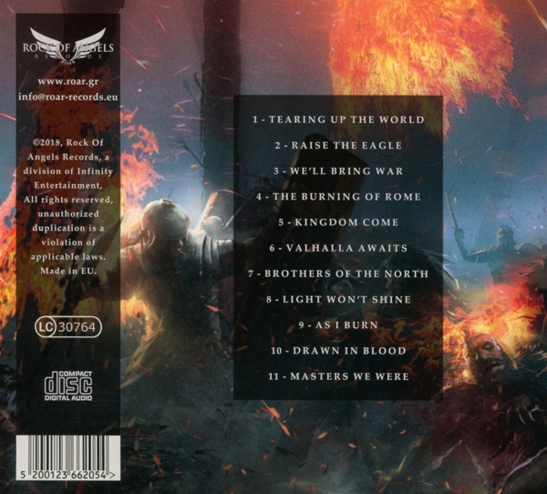01. "Tearing up the world" 02. "Raise the eagle" 03. "We'll bring war" 04. "The burning of Rome" 05. "Kingdom come" 06. "Valhalla awaits" 07. "Brothers of the North" 08. "Light won't shine" 09. "As I burn" 10. "Drawn in blood" 11. "Masters we were"