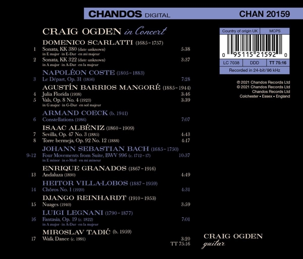Beschreibung:Described by BBC Music Magazine as 'A worthy successor to Julian Bream', the Australian-born guitarist Craig Ogden is one of the most exciting artists of his generation. He studied guitar from the age of seven and in 2004 became the youngest instrumentalist to receive a Fellowship Award from the Royal Northern College of Music. He has performed concertos with many of the world's leading orchestras and numerous composers have written works specially for him. Despite a diverse and extensive discography, Craig Ogden had never made an album based on his regular recital repertoire. This latest album consists of pieces he regularly plays in concert and includes a wide variety of music, spanning three centuries. Offering both transcriptions and original works, it is all music that he loves to play, and a programme that reflects the wonderful diversity within the repertoire of the modern classical guitar., Runningtime: 00:00:00, Labelcode CHN20159.2