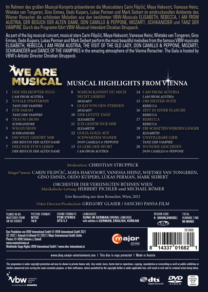 | | Beschreibung: | As part of the big musical concert, musical stars Carin Filipcic, Maya Hakvoort, Vanessa Heinz, Wietske van Tongeren, Gino Emnes, Oedo Kuipers, Lukas Perman and Mark Seibert perform the most beautiful melodies from the famous musicals Tanz der Vampire (Dance of the Vampires), Mozart!, I am from Austria, Don Camillo & Peppone, Rebecca, Elisabeth, Der Besuch der alten Dame (The Visit) and Schikaneder in the impressive ambience of the Vienna Ronacher. VBW musical director Christian Struppeck leads the program. The name Vereinigte Bühnen Wien (VBW) is synonymous with great musical theatre. Whether from Austria or abroad, our audiences at the Ronacher and the Raimund Theater enjoy Austrian and European German-language premieres of hit international musicals. We attract the most talented practitioners in the international musical scene - directors, choreographers, set designers, composers and librettists - to create in-house productions of the highest quality, accompanied as always by our renowned 80-piece VBW orchestra., Runningtime: 00:00:00, Labelcode CMAJ761008DVD |  | | Darsteller: |