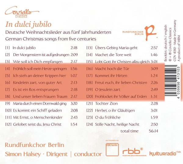 01. "In dulci jubilo" 02. "Der Morgenstern ist aufgedrungen" 03. "Wie soll ich dich empfangen" 04. "Fr?hlich soll mein Herze springen" 05. "Ich steh an deiner Krippen hier" 06. "Kindlein zart, von guter Art" 07. "Es ist ein Ros entsprungen" 08. "Und unser lieben Frauen Traum" 09. "Maria durch ein' Dornwald ging" 10. "Es kommt ein Schiff, geladen" 11. "Mit Ernst, o Menschenkinder" 12. "Gelobet seist du, Jesu Christ" 13. "?bers Gebirg Maria geht" 14. "Machet die Tore weit" 15. "Lobt Gott, ihr Christen allzugleich" 16. "Macht hoch die Tür" 17. "Kommet, ihr Hirten" 18. "Freut euch, ihr lieben Christen" 19. "O Jesulein zart" 20. "Frohlocket, ihr V?lker auf Erden" 21. "Tochter Zion" 22. "Herbei, o ihr Gl?ubigen" 23. "O du fr?hliche" 24. "Stille Nacht, heilige Nacht"