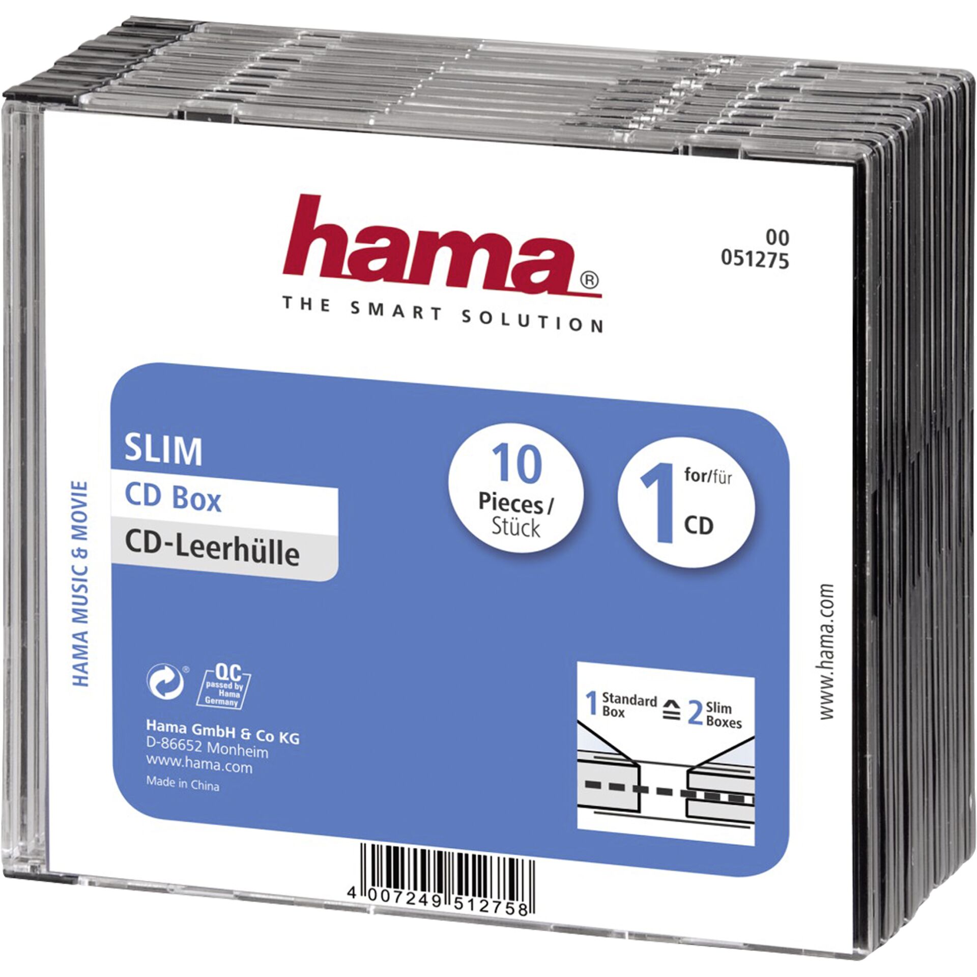 Leerhülle für 1 CD Transparent/schwarz Gruppe Speicherzubehör Hersteller Hama Hersteller Art. Nr. 51275 EAN/UPC Produktbeschreibung: CD-Leerhülle SlimLine 10Pk. - CD Leerhülle Produkttyp CD Leerhülle Kapazität 1 Lokalisierung Deutschland