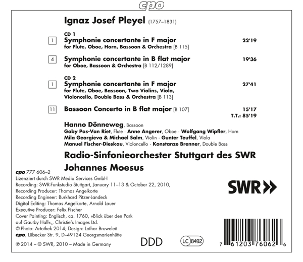 Disc 02 Sinfonie Concertante F-Dur (für Fl?te, Oboe, Fagott, 2 Violinen, Viola, Violoncello, Kontrabass und Orchester) 01. Angerer, Anne "1. Allegro" 02. Angerer, Anne "2. Adagio espressivo" 03. Angerer, Anne "3. Thema: Andante grazioso" 04. Angerer, Anne "4. Variation 1" 05. Angerer, Anne "5. Variation 2" 06. Angerer, Anne "6. Variation 3" 07. Angerer, Anne "7. Variation 4" 08. Angerer, Anne "8. Variation 5" 09. Angerer, Anne "9. Variation 6" 10. Angerer, Anne "10. Variation 7: Presto" Konzert für Fagott und Orchester B-Dur 11. D?nneweg, Hanno "1. Allegro moderato" 12. D?nneweg, Hanno "2. Romance: Cantabile" 13. D?nneweg, Hanno "3. Rondo: Allegretto"