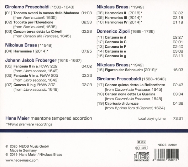 Fiori musicali (Musikalische Blumen) (Venedig 1635) (Auszug) 01. "Toccata avanti la messa della Madonna" 02. "Toccata per l'Elevatione" Canzoni alla Francese (1645) (Auszug) 03. "Canzon terza detta La Crivelli" 04. "Harmonies I (2014)" Libro secondo (1649) (Auszug) 05. "Fantasie Nr. 2 a-moll FbWV 202" 06. "Fantasie Nr. 5 a-moll FbWV 205" 07. "Canzon II g-moll FbWV 302" 08. "Harmonies II (2018)" 09. "Harmonies III (2014)" 10. "Harmonies IV (2014)" 11. "Canzona d-moll" 12. "Canzona C-Dur" 13. "Canzona F-Dur" 14. "Canzona e-moll" 15. "Canzona g-moll" 16. "Figuren der Sehnsucht (2019)" Canzoni alla Francese (1645) (Auszug) 17. "Canzon quinta detta La Bellerofonte" 18. "Canzon nona detta La Querina" Il primo libro di Capricci (1624) (Auszug) 19. "Capriccio di durezze"
