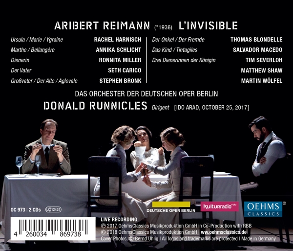 | Beschreibung: | For L'Invisible, like his other two most recent operas Bernarda Alba's House and Medea, Aribert Reimann has turned to a text of world literature, adapting it himself as his own librettist. With it, he returns to his "home" opera house the Deutsche Oper Berlin. Four of his stage works were commissioned by that opera house and the world premiere of his new, ninth opera was also given there. It was staged by Vasily Barkhatov, one of the most interesting Russian directors of his generation, who made his debut at the opera house on Bismarckstrasse after having worked at the Moscow Bolshoi Theatre and the Mariinski Theater in St. Petersburg. The premiere was conducted by the Principal Conductor himself, Donald Runnicles., Runningtime: 00:00:00, Labelcode OEHM973.2 |