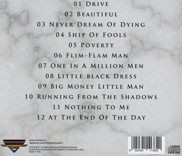 01. "Drive" 02. "Beautiful" 03. "Never dream of dying" 04. "Ship of fools" 05. "Poverty" 06. "Flim-Flam Man" 07. "One in a million men" 08. "Little black dress" 09. "Big money little man" 10. "Running from the shadows" 11. "Nothing to me" 12. "At the end of the day"