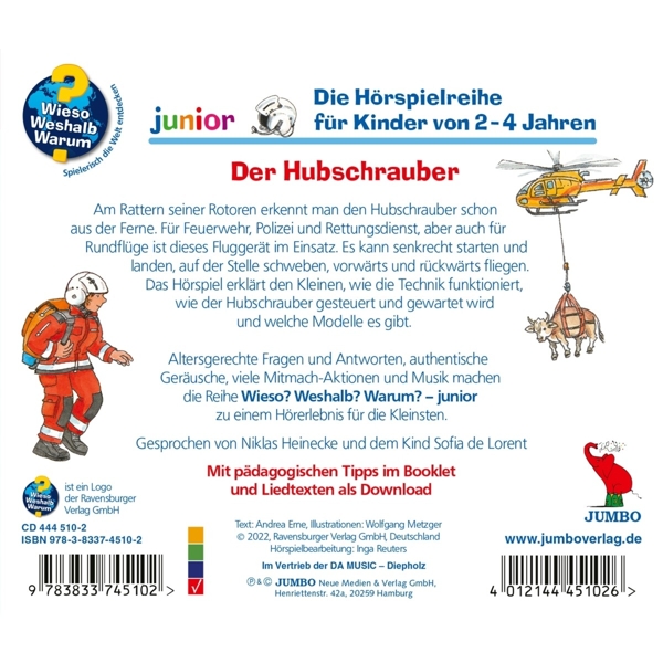 01. Heinecke, Niklas / De Lorent, Sofia "Ansage" 02. Heinecke, Niklas / De Lorent, Sofia "Mein kleines "Wieso? Weshalb? Warum?"-Lied (Intro)" 03. Heinecke, Niklas / De Lorent, Sofia "Was ist ein Hubschrauber und wie hebt der Hubschrauber ab?" 04. Heinecke, Niklas / De Lorent, Sofia / Metcalf, Robert / Stern 5 / Sprick, Lea / +++ "Lied: Karussell" 05. Heinecke, Niklas / De Lorent, Sofia "Wie wird der Hubschrauber gesteuert?" 06. Heinecke, Niklas / De Lorent, Sofia / Metcalf, Robert / Stern 5 / Sprick, Lea / +++ "Lied: Ich fliege" 07. Heinecke, Niklas / De Lorent, Sofia "Wann kommt der Rettungshubschrauber?" 08. Heinecke, Niklas / De Lorent, Sofia "Wann kommt der Rettungshubschrauber?" 09. Heinecke, Niklas / De Lorent, Sofia "Wozu gibt es Polizeihubschrauber?" 10. Heinecke, Niklas / De Lorent, Sofia "Wozu gibt es Polizeihubschrauber?" 11. Heinecke, Niklas / De Lorent, Sofia "Was macht ein Hubschrauber in den Bergen?" 12. Heinecke, Niklas / De Lorent, Sofia / Metcalf, Robert / Stern 5 / Sprick, Lea / +++ "Lied: Helikopter" 13. Heinecke, Niklas / De Lorent, Sofia "Wie helfen der Hubschrauber repariert?" 14. Heinecke, Niklas / De Lorent, Sofia "Wie helfen der Hubschrauber repariert?" 15. Heinecke, Niklas / De Lorent, Sofia "Wo wird der Hubschrauber repariert?" 16. Heinecke, Niklas / De Lorent, Sofia / Metcalf, Robert / Stern 5 / Sprick, Lea / +++ "Lied: Ich fliege" 17. Heinecke, Niklas / De Lorent, Sofia "Mein kleines "Wieso? Weshalb? Warum?"-Lied (Extro)"