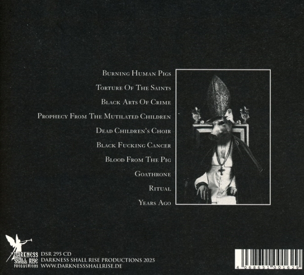1: Psalm I - Burning Human Pigs (4:10) 2: Psalm II - Torture Of The Saints (4:14) 3: Psalm III - Black Arts Of Crime (3:51) 4: Psalm IV - Prophecy From The Mutilated Children (4:18) 5: Psalm V - Dead Children's Choir (4:09) 6: Psalm VI - Black Fucking Cancer (4:10) 7: Psalm VII - Blood From The Pig (4:40) 8: Psalm VIII - Goathrone (3:32) 9: Psalm IX - Ritual (4:16) 10: Psalm X - Years Ago (2:58) 11: Black Arts Of Crime (2024 Re-recording) ()