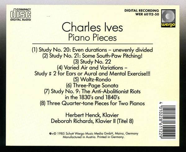 Beschreibung:In addition to his two piano sonatas, the most extensive compositions among his works, Ives wrote a series of shorter piano pieces of which those that have been published are collected on this recording. United in such a manner, they present a kind of cross-section of Ives' compositional output setting in relief at the same time several characteristics of his music. Marches, chorales, ragtimes, waltzes, popular American songs, classical quotations, sounds that recede and sounds that approach from the distance, thickly woven contrapuntal movements, seriousness, wit and high spirits, melancholy, pathos and irony, they all find themselves in an often colourful, inimitable mixture, often in the same piece, often in provoking juxtaposition. Cross-connections between the individual pieces as well as between them and others of his works are portraits, as obvious as they are characteristic, of a compositional technique that as strongly resisted the exclusion of any kind of musical materials as it was effortlessly able to integrate them. Such an approach to traditional styles and subjects, formal construction, playing techniques, form types, tuning systems, or conventions of performance, incorporating these materials to the point of disintegration, sometimes in abrupt confrontation, gives his music character and stature, and identifies Ives as one of the truly experimental composers of our century whose ideas have since been carried on in an even broader and more radical sense by John Cage.This production received the quarterly German Record Critics' Award., Runningtime: 00:00:00, Labelcode WER60112.2