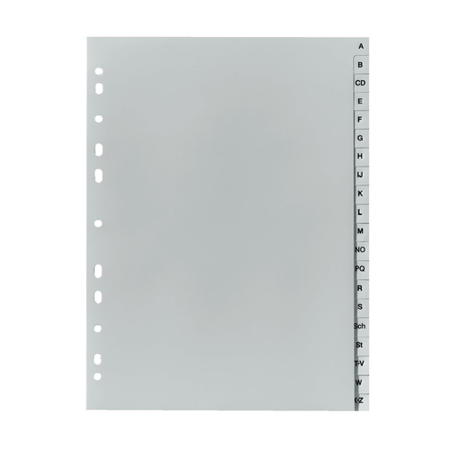 Hauptmerkmale Funktionen Typ Alphabetischer Registerindex Material Polypropylen (PP) Produktfarbe Grau Anzahl der Reiter 20 Ausrichtung Porträt Format A4 Verpackungsinformation Anzahl 1