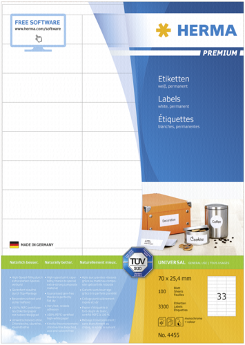 Details: Media Medientyp Selbstklebende Etiketten Mediengrößen 25.4 x 70 mm Drucktechnologie Nadel, Tintenstrahl, Laser Format Medien mit Karten A4 (210 x 297 mm) Medienfarbe Weiß Anz. Karten/Etiketten pro Blatt/Rolle 33 Anz. Medien mit Karten 100 Bogen Enthaltene Menge 3300 Stck