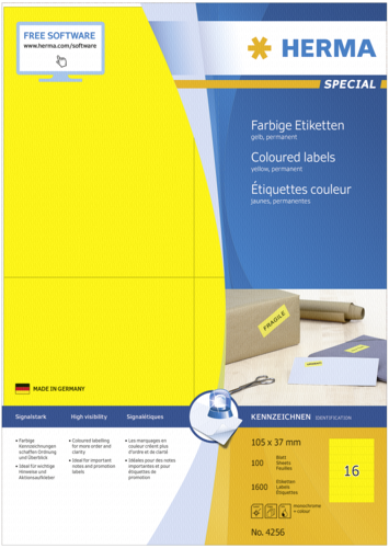 HERMA SuperPrint - Selbstklebende Etiketten - Gelb - 37 x 105 mm - 1600 Stck. Gruppe Druckerverbrauchsmaterial Hersteller HERMA Hersteller Art. Nr. 4256 Modell SuperPrint EAN/UPC 4008705042567 Produktbeschreibung: HERMA SuperPrint - selbstklebende Etiketten - 1600 Stck. Medientyp Selbstklebende Etiketten Mediengröße 37 x 105 mm Drucktechnologie Nadel, Tintenstrahl, Laser Format Medien mit Karten A4 (210 x 297 mm) Medienfarbe Gelb Anz. Karten/Etiketten pro Blatt/Rolle 16 Anz. Medien mit Karten 100 Bogen Enthaltene Menge 1600 Stck.