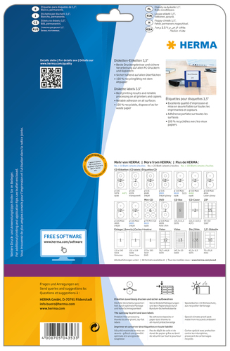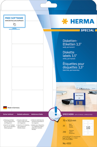 Der Artikel "Disketten-Etiketten weiß 70x50,8 mm Papier 250 St." von der Marke Herma ist Weiß. Das Produkt verfügt über folgende Drucktechnologie: Laser/Inkjet, ist aus Papier und wird ein Gesamtgewicht von 300 g haben.