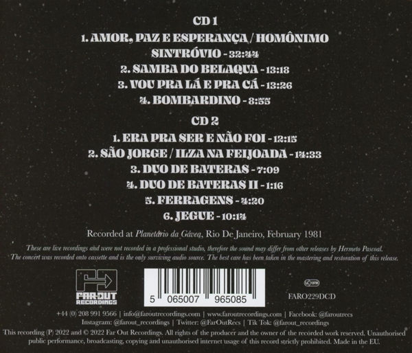 Disc 02 01. "Era pra ser e nao foi (Live At Planetário Da Gávea, Rio De Janeiro, February 1981)" 02. "Sao Jorge / Iliza na feijoada (Medley) (Live At Planetário Da Gávea, Rio De Janeiro, February 1981)" 03. "Duo de bateras [Part 1] (Live At Planetário Da Gávea, Rio De Janeiro, February 1981)" 04. "Duo de bateras [Part 2] (Live At Planetário Da Gávea, Rio De Janeiro, February 1981)" 05. "Ferragens (Live At Planetário Da Gávea, Rio De Janeiro, February 1981)" 06. "Jegue (Live At Planetário Da Gávea, Rio De Janeiro, February 1981)"