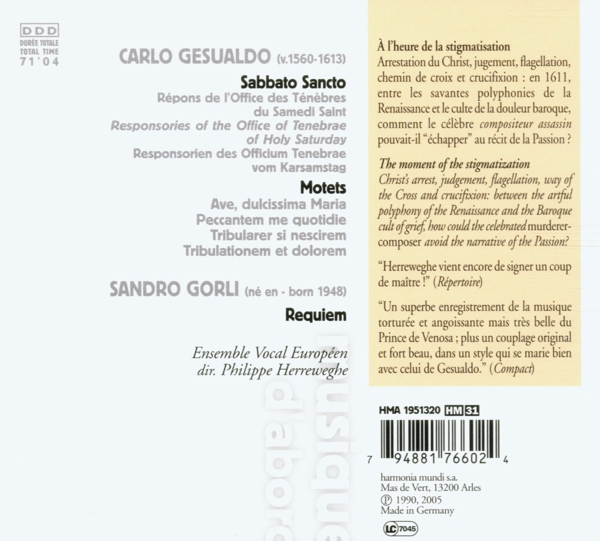 Sabbato Sancto 01. "Resp. 1: Sicut ovis ad occisionem" 02. "Resp. 2: Jerusalem, surge" 03. "Resp. 3: Plange quasi virgo" 04. "Resp. 4: Recessit pastor noster" 05. "Resp. 5: O vos omnes" 06. "Resp. 6: Ecce quomodo moritur justus" 07. "Resp. 7: Astiterunt reges terrae" 08. "Resp. 8: Aestimatus sum" 09. "Resp. 9: Sepulto Domino" 10. "Ave, dulcissima Maria (Motette)" 11. "Peccantem me quotidie" 12. "Tribularer si nescirem" 13. "Tribulationem et dolorem" Requiem 14. "1. Morti, moriamo ancora..." 15. "2. Bambino, quando morir?" 16. "3. Prendimi fra le tue braccia" 17. "4. Lieve, lieve, molto lieve" 18. "5. Padre, padre"