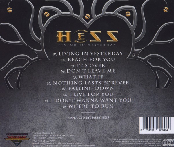 01. "Living in yesterday" 02. "Reach for you" 03. "It's over" 04. "Don't leave me" 05. "What if" 06. "Nothing lasts forever" 07. "Falling down" 08. "I live for you" 09. "I don't wanna want you" 10. "Where to run"
