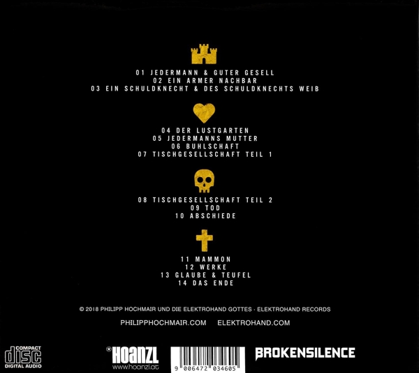 Der aus Osterreich stammende Schauspieler PHILLIP HOCHMAIR präsentiert seine leidenschaftliche 'Jedermann'-Solointerpretation mit der Band DIE ELEKTROHAND GOTTES jetzt auch als vollständiges Musik / Hörspielalbum. Das Ergebnis ist ein avantgardistisches, dramaturgisch perfekt initiiertes Musikschauspiel und erscheint als CD und Doppel-LP auf dem bandeigenen Label ELEKTROHAND GOTTES. Der 1973 in Wien geborene HOCHMAIR hat nach seinem Studium (u.a. bei KLAUS MARIA BRANDAUER) erst in zahlreichen...