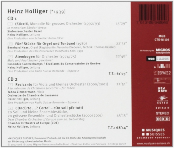Beschreibung:Composed By: Heinz Holliger, Engineer: Dietrich Wohlfromm, Engineer: Jean-Claude Renou, Executive-Producer: Claudio Danuser, Liner Notes: Kristina Ericson, Liner Notes [Translation]: Chris Walton (4), Liner Notes [Translation]: Jacques Lasserre, Mastered By, Recording Supervisor: Andreas Werner (4), Organ [Registrant]: Veronika Diederen, Producer: Eric Lavanchy, Producer: Gérard Allaz, Producer: Harry Vogt, Producer: Luc Terrapon, Recording Supervisor: Martine Guers-Fernoux, Recording Supervisor: Philippe Hamilton, Recording Supervisor: Stephan Hahn, Technician [Sound]: Jakob Händel, Technician [Sound]: Thomas Kessler, Conductor: Heinz Holliger, Orchestra: Basler Sinfonie-Orchester, Organ: Bernhard Haas, Conductor: Heinz Holliger, Ensemble: Ensemble Contrechamps, Ensemble: Etudiants du Conservatoire de Genève, Conductor: Heinz Holliger, Orchestra: Orchestre De Chambre De Lausanne, Viola: Tabea Zimmermann, Conductor: Heinz Holliger, Orchestra: The Chamber Orchestra Of Europe, Labelcode MQS105.2 (MGB CTS-M 105), Phonographic Copyright (p) Migros-Genossenschafts-Bund, Copyright (c) Migros-Genossenschafts-Bund, Produced At SRF Schweizer Radio Und Fernsehen, DRS 2, Produced At Radio Suisse Romande, Produced At Westdeutscher Rundfunk