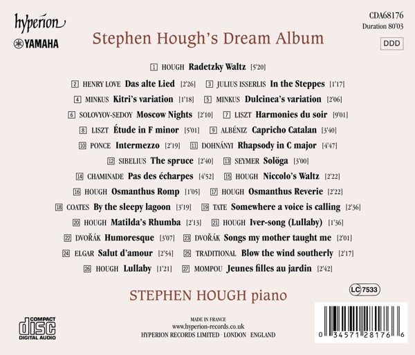 01. "Radetzky-Walzer (nach Johann Strauss (Vater))" 02. "Das alte Lied (transkr. von Stephen Hough)" 03. "In the steppes op. 11 Nr. 2" Don Quixote (Ballett) (Auszug) 04. "Kitris Variation (transkr. von Stephen Hough)" 05. "Dulcineas Variation (transkr. von Stephen Hough)" 06. "Moscow nights (transkr. von Stephen Hough)" tudes d'ex?cution transcendante S 139 Nr. 1-12 (Auszug) 07. "Nr. 11 Harmonie du soir" 08. "Nr. 10 Etüde f-moll" Espa¤a op. 165 (Auszug) 09. "Nr. 5 Katalanisches Capriccio (bearb. von Stephen Hough)" 10. "Intermezzo für Klavier Nr. 1" 11. "Rhapsodie C-Dur op. 11 Nr. 3" Stücke für Klavier op. 75 Nr. 1-5 (Die B?ume) (Auszug) 12. "Nr. 5 Kuusi" 13. "Sol?ga (Sonnenauge) op. 11 Nr. 3" 14. "Pas des ?charpes" 15. "Niccolo's waltz (nach Niccol? Paganini)" 16. "Osmanthus romp" 17. "Osmanthus reverie" 18. "By the sleepy Lagoon" 19. "Somewhere a voice is calling (transkr. von Stephen Hough)" 20. "Matilda's rhumba (bearb. von Stephen Hough)" 21. "Iver-song (Wiegenlied)" 22. "Humoreske Ges-Dur op. 101 Nr. 7" Lieder op. 55 Nr. 1-7 (Zigeunermelodien) (Auszug) 23. "Nr. 4 Songs my mother taught me (transkr. von Stephen Hough)" 24. "Salut d'amour op. 12" 25. "Blow the wind southerly (bearb. von Stephen Hough)" 26. "Wiegenlied" Sc?nes d'enfants Nr. 1-5 (für Klavier) (Auszug) 27. "Nr. 5 Jeunes filles au jardin"
