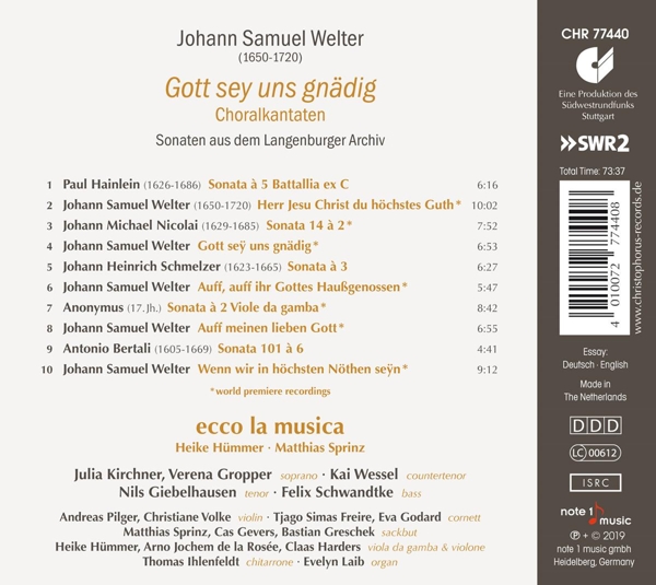| Beschreibung: | True treasures of unknown music can still be discovered: One of these unknown is the composer Johann Samuel Welter, who was born in 1650 near Schwäbisch Hall (Württemberg) and, apart from a few years as an apprentice in Nuremberg, always remained faithful to his homeland. In the free imperial city of Schwäbisch Hall a free reformatory spirit prevailed, and Welter worked there for 45 years as organist at the main church of St. Michael until his death in 1720. He was certainly offered positions in Berlin, Frankfurt or Augsburg and is said to have composed over 400 works, but unfortunately only just under a dozen vocal works have survived. For his sacred cantatas Welter was well known and highly respected far beyond the borders of his country. Today he must be regarded as the most important composer of choral cantatas between Praetorius and J.S. Bach. The Ensemble ecco la musica presents with five first recordings the great quality of the composer and complements it with instrumental music by Schmelzer, Bertali, Nicolai and others from the Langenburg Archive in the direct vicinity of Welter., Runningtime: 00:00:00, Labelcode CHS77440.2 |