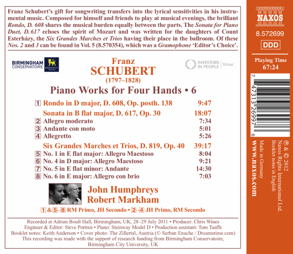 Franz Schubert's gift for songwriting transfers into the lyrical sensitivities in his instrumental music. Composed for himself and friends to play at musical evenings the brilliant Rondo D. 608 shares the musical burden equally between the parts. The Sonata for Piano Duet D. 617 echoes the spirit of Mozart and was written for the daughters of Count Esterh+ízy the Six Grandes Marches et Trios having their place in the ballroom. Of these Nos. 2 and 3 can be found in Vol. 5 (8570354) which was a Gramophone 'Editor's Choice'., Runningtime: 00:00:00, Labelcode NXS8572699.2