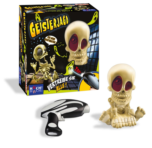 Warnhinweis: Licht aus und Action! Bei der Geisterjagd bewegt der gruselige Johnny Skeletti seinen Kopf in alle Richtungen. Dabei projiziert er für einen kurzen Augenblick schaurige Geister an die Wand. Wer schafft es, möglichst viele Gespenster mit der Lichtpistole zu vertreiben, wenn er an der Reihe ist?